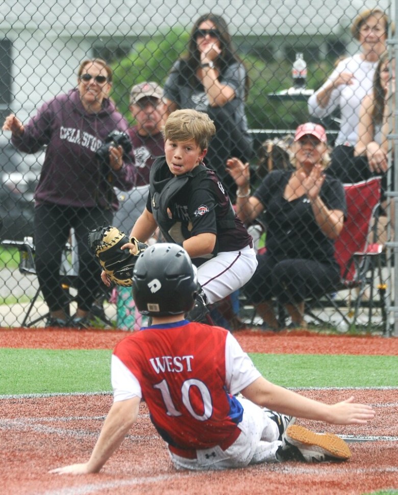 14875# 01baseball WATERVILLE, MAINE JULY 19, 2021. Andy Valley, Maine baserunner Shawn West, bottom skids safely into home as Chelmsford, Mass. catcher Jack Giacchetto (cq) lunges with the tag on a passed ball during the Cal Ripken 11U New England regional baseball tournament at Little Wrigley Field in Waterville, Maine Monday July 19, 2021. Chelmsford went on to win the game. (Rich Abrahamson/Morning Sentinel)