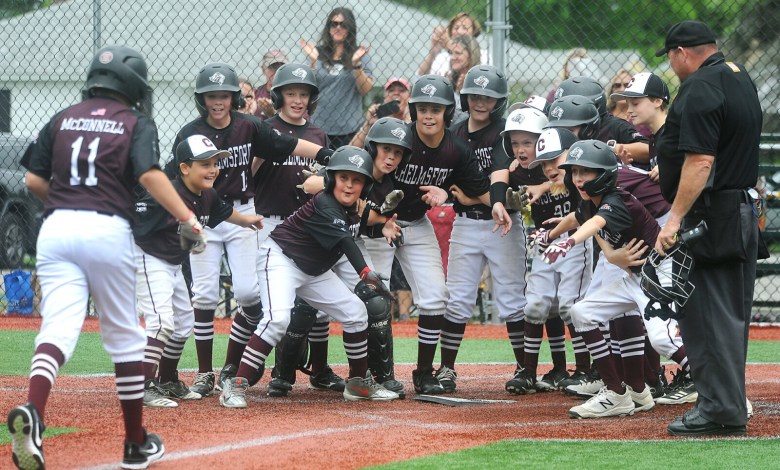 14875# 01baseball WATERVILLE, MAINE JULY 19, 2021. Chelmsford, Mass. hitter Jimmy McConnell, left is greeted by teammates at home after McConnell smashed a three run homer against Andy Valley Maine during the Cal Ripken 11U New England regional baseball tournament at Little Wrigley Field in Waterville, Maine Monday July 19, 2021. Chelmsford went on to win the game.(Rich Abrahamson/Morning Sentinel)