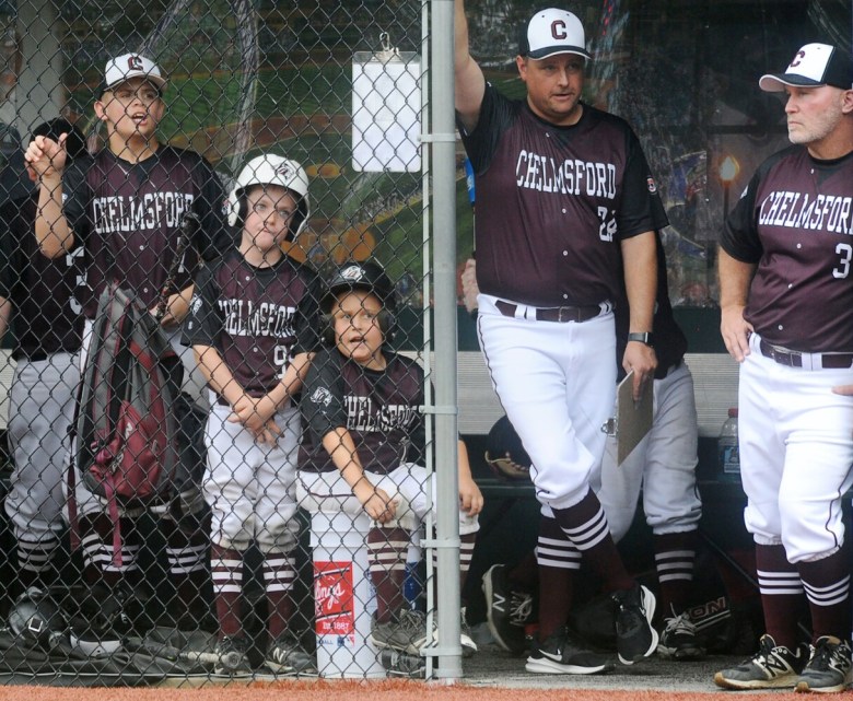 14875# 01baseball WATERVILLE, MAINE JULY 19, 2021. Chelmsford, Mass. players and coaches watch the action during the game against Andy Valley, Maine during the Cal Ripken 11U New England regional baseball tournament at Little Wrigley Field in Waterville, Maine Monday July 19, 2021. Chelmsford went on to win the game.(Rich Abrahamson/Morning Sentinel)