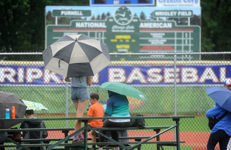 Spectators shelter under umbrellas as a light rain fell during an 11U Cal Ripken New England regional tournament game on July 19, 2021 at Little Wrigley Field in Waterville. Little Wrigley and Little Fenway in Waterville will host the 12U Cal Ripken World Series next month.