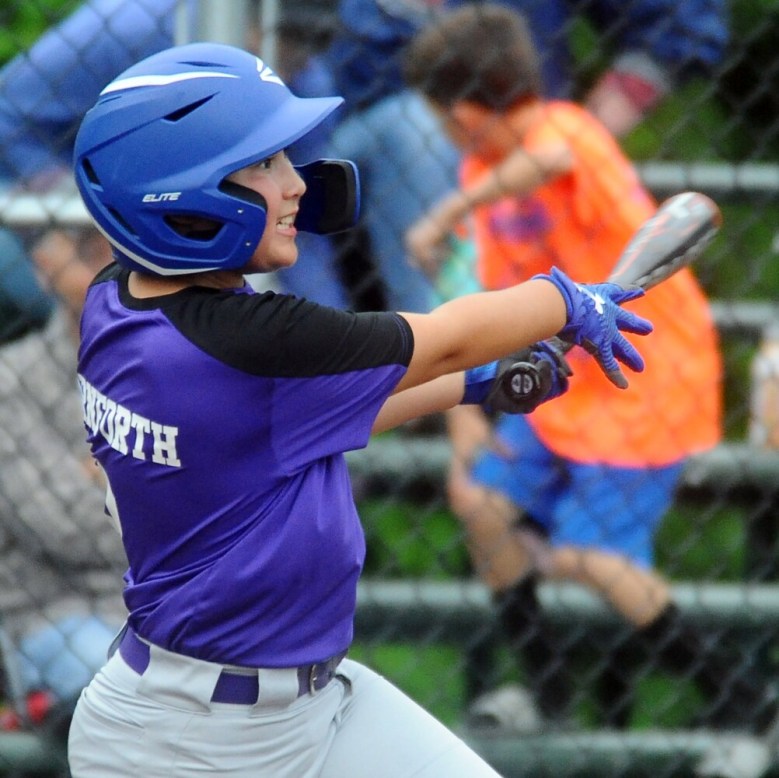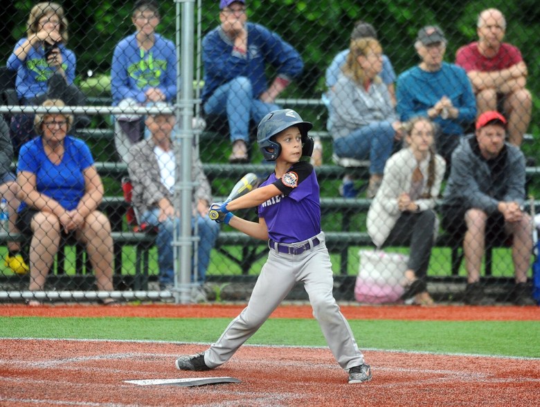 14875# 01baseball WATERVILLE, MAINE JULY 19, 2021. Waterville hitter Maxwell Cornforth watches the ball while clubbing a solo homer during action against Seacoast, New Hampshire at the Cal Ripken 11U New England regional baseball tournament at Little Wrigley Field in Waterville, Maine Monday July 19, 2021.(Rich Abrahamson/Morning Sentinel)