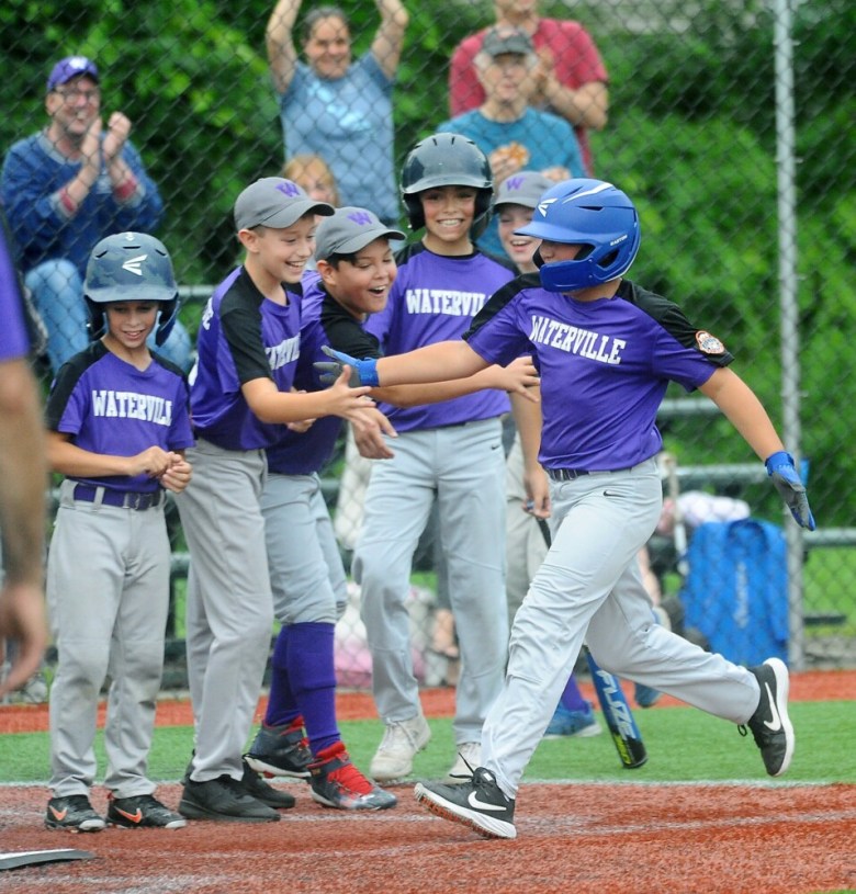 14875# 01baseball WATERVILLE, MAINE JULY 19, 2021. Waterville hitter Maxwell Cornforth, right, is greeted by teammates at home after he slugged a solo homerun during action against Seacoast, New Hampshire at the Cal Ripken 11U New England regional baseball tournament at Little Wrigley Field in Waterville, Maine Monday July 19, 2021.(Rich Abrahamson/Morning Sentinel)