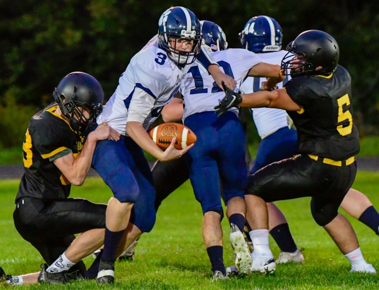 One of the players missing was quarterback Chris Reid. Owen Dunn filled in and ran for 45 yards while teammate Mark Thibodeau rushed for 58, but mistakes primarily with missed blocks, broken tackles and wild snaps prevented Maranacook from rallying back in a close game.