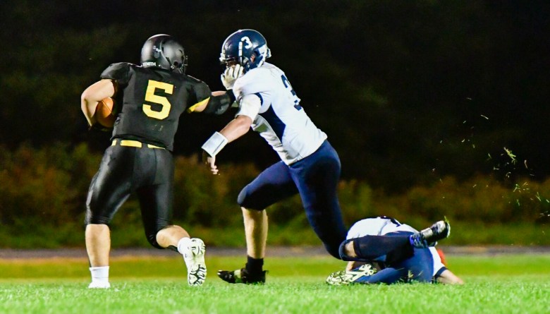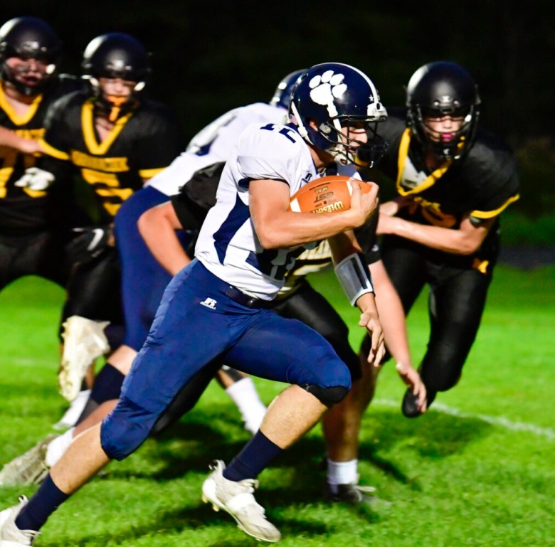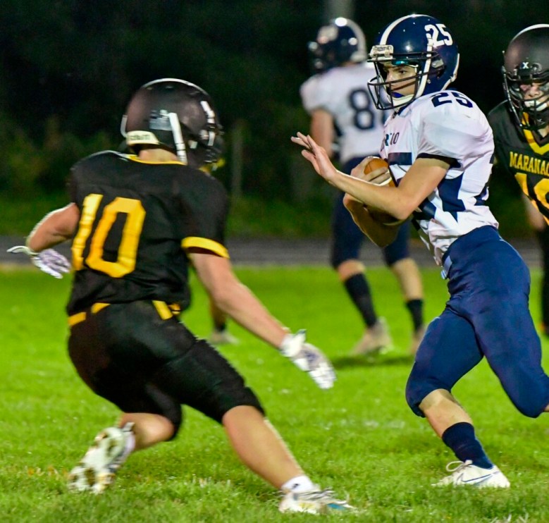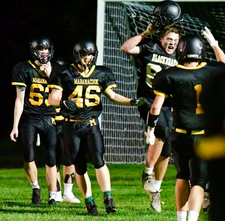 One of the players missing was quarterback Chris Reid. Owen Dunn filled in and ran for 45 yards while teammate Mark Thibodeau rushed for 58, but mistakes primarily with missed blocks, broken tackles and wild snaps prevented Maranacook from rallying back in a close game.