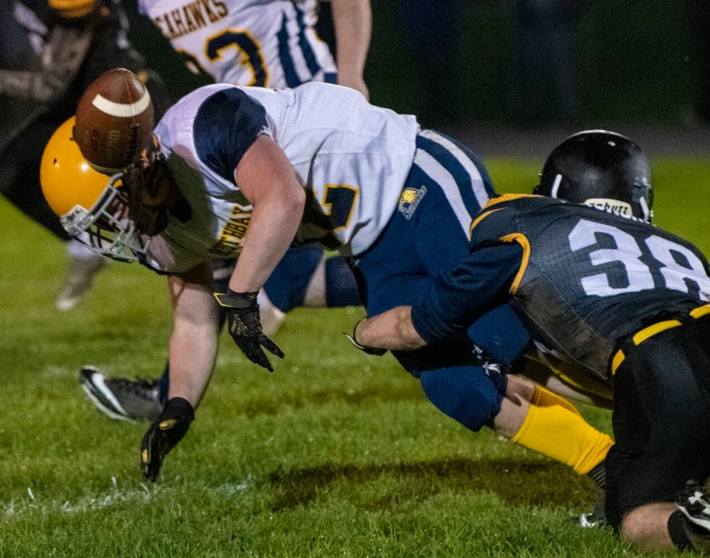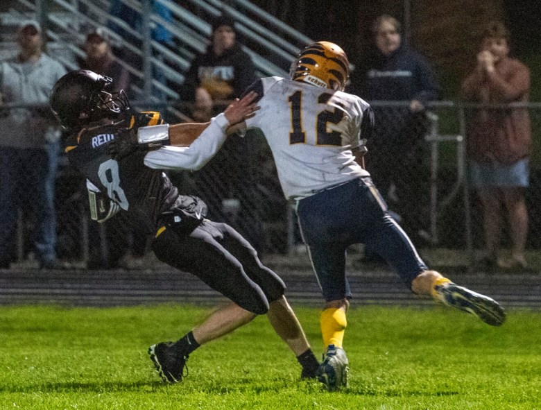 “It’s funny, we never actually had him on defense until last week when we needed him to play defense,” said Maranacook assistant coach Jacob Bessey, who was filling in for head coach Jordan DeMillo for the evening. “Then he had a pick-six last week… He’s a special athlete. He’s 100 percent all the time, and he loves to score, loves to play. He’s pretty good, pretty special.”