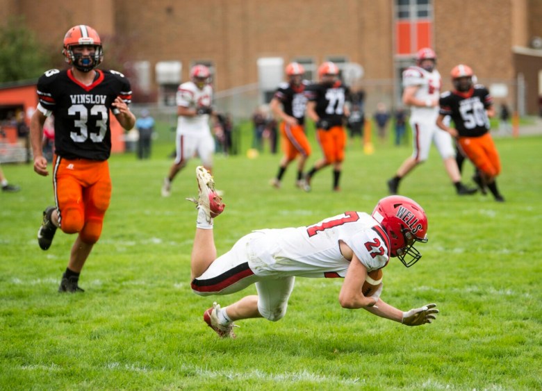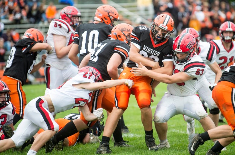 Wells’ offense broke open the game, but the Warriors’ defense was superb against the Winslow backfield. Wells’ front of ends Fazzina, Michael Lewinski and Nathan Coleman and tackles Gavyn Petrie and Isaiah Martinez won the battle up front over and over again, and prevented Matt Quirion (20 carries, 80 yards), Bourget (five carries, 17 yards) and Jack Dorval (six carries, 24 yards) from having anywhere consistently to go.