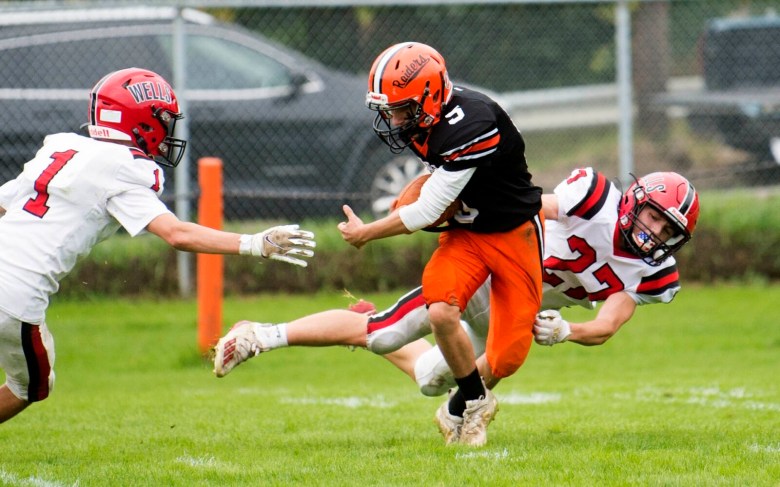 Brayden Fazzina and Conner Whitten each ran for two touchdowns, Brady Fox found Colby Bolduc for two more through the air, and Wells shut down Winslow’s strong running game and rolled to a 49-13 victory over the Black Raiders.