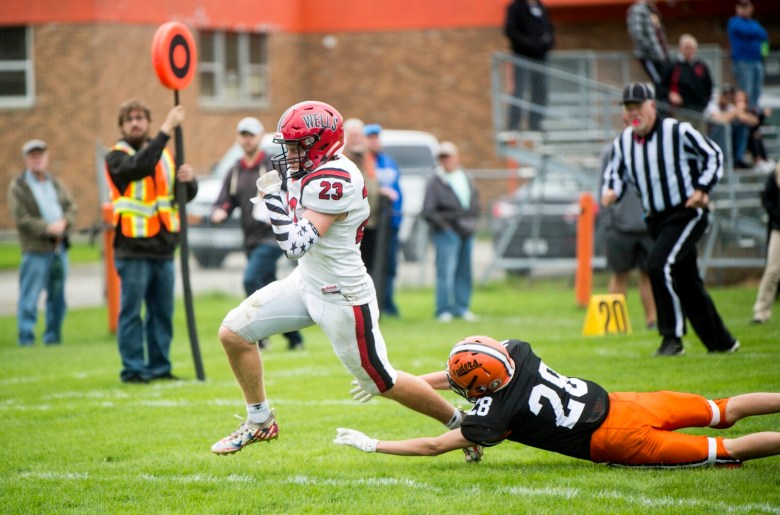 Wells needed to go only 32 yards on its next drive for a touchdown, scored when Fazzina (seven carries, 29 yards) ran in from a yard out, and it was Whitten, a sophomore, scoring on a 5-yard run just before halftime two drives later for a 28-0 lead.