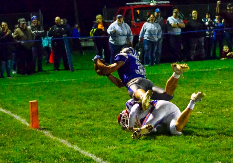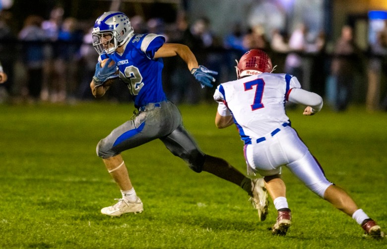 The game was nothing short of a track meet between two players: Doucette, a senior, who ran for 210 yards on 23 carries and accounted for four touchdowns (three rushing, one passing). The other was Lawrence junior running back Parker Higgins, who rushed for 287 yards on 24 carries and scored all six of the Bulldogs’ touchdowns.