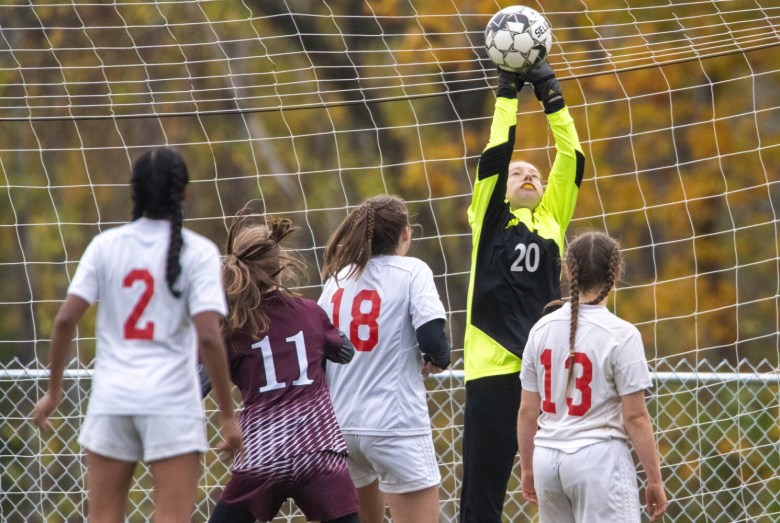 Cony keeper Kylee Huard (20) makes a save against Nokomis during a Class B North girls soccer prelim Saturday in Newport. Michael G. Seamans/Morning Sentinel