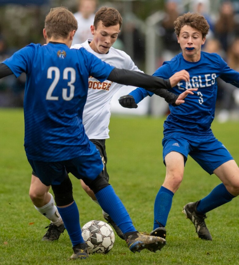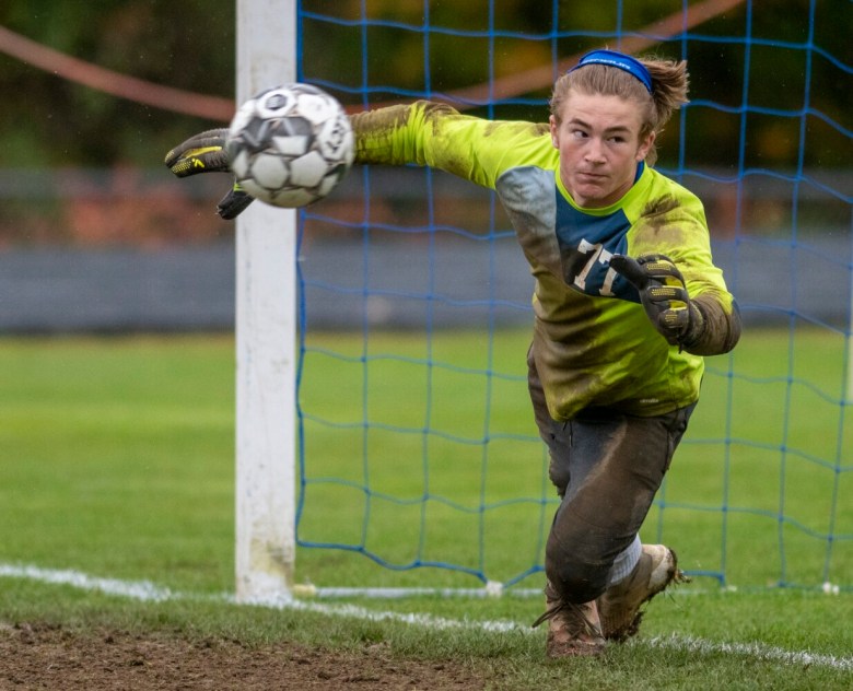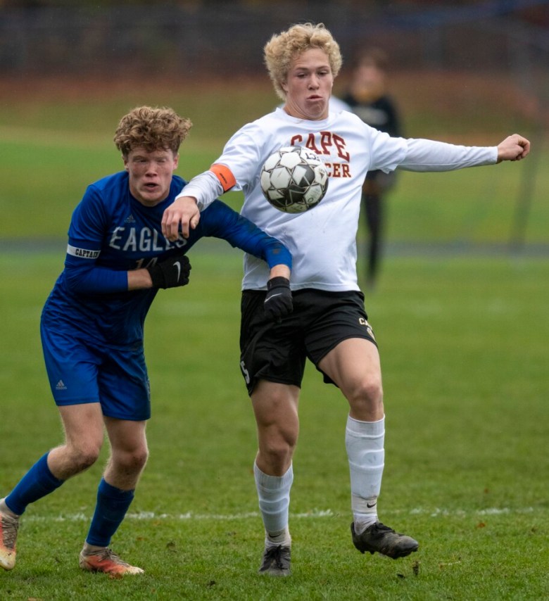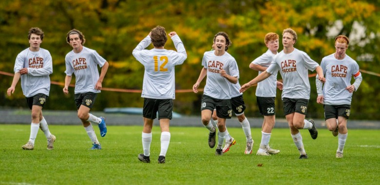 After the teams engaged in an early feeling-out period, Cape struck first in the 9th minute when Eddie Caldera, stationed in the left side of the box, converted Lathrop’s feed from outside and past diving Erskine goalkeeper Timber Parlin (seven saves), his neon jersey already muddy from the pregame warmup. Lathrop made it 2-0 in the 14th minute when he recovered a scramble in front of the net and netted his second goal three minutes later. After Erskine was carded for a tackle inside the box, Cape Elizabrth’s Stewart Kelley made it 4-0 on a penalty kick in the 32nd minute, a lead the Capers took into halftime.