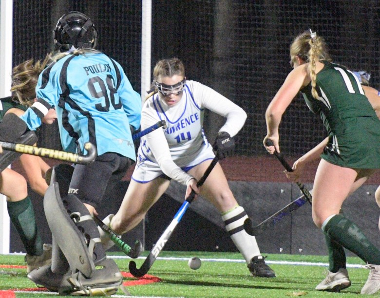Lawrence had a 10-0 advantage on corners over Old Town in the third quarter, but was only able to get three shots on goal, all stopped by Old Town goalie Cote. The Bulldogs again had the corner advantage, 5-1, in the fourth quarter, but managed two shots on goal.