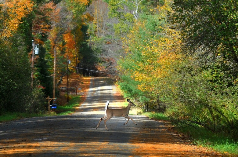 A deer dashes across a road in Mercer on Sept. 30. This photo won first place for a scenic photo in the annual Maine Press Association contest.