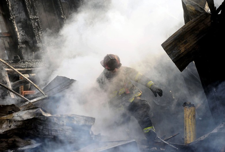 A firefighter works amid the burned remains of a building that was destroyed in a three alarm fire at Folsoms Auto Sales, Service & Salvage in Skowhegan Monday. This photo took 3rd place in spot news.
