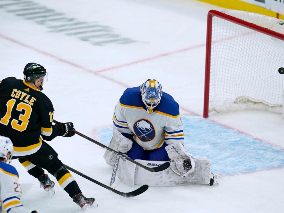 Charlie Coyle ends a long scoring drought and Boston gets three goals in the third period to beat Buffalo, 5-2.
