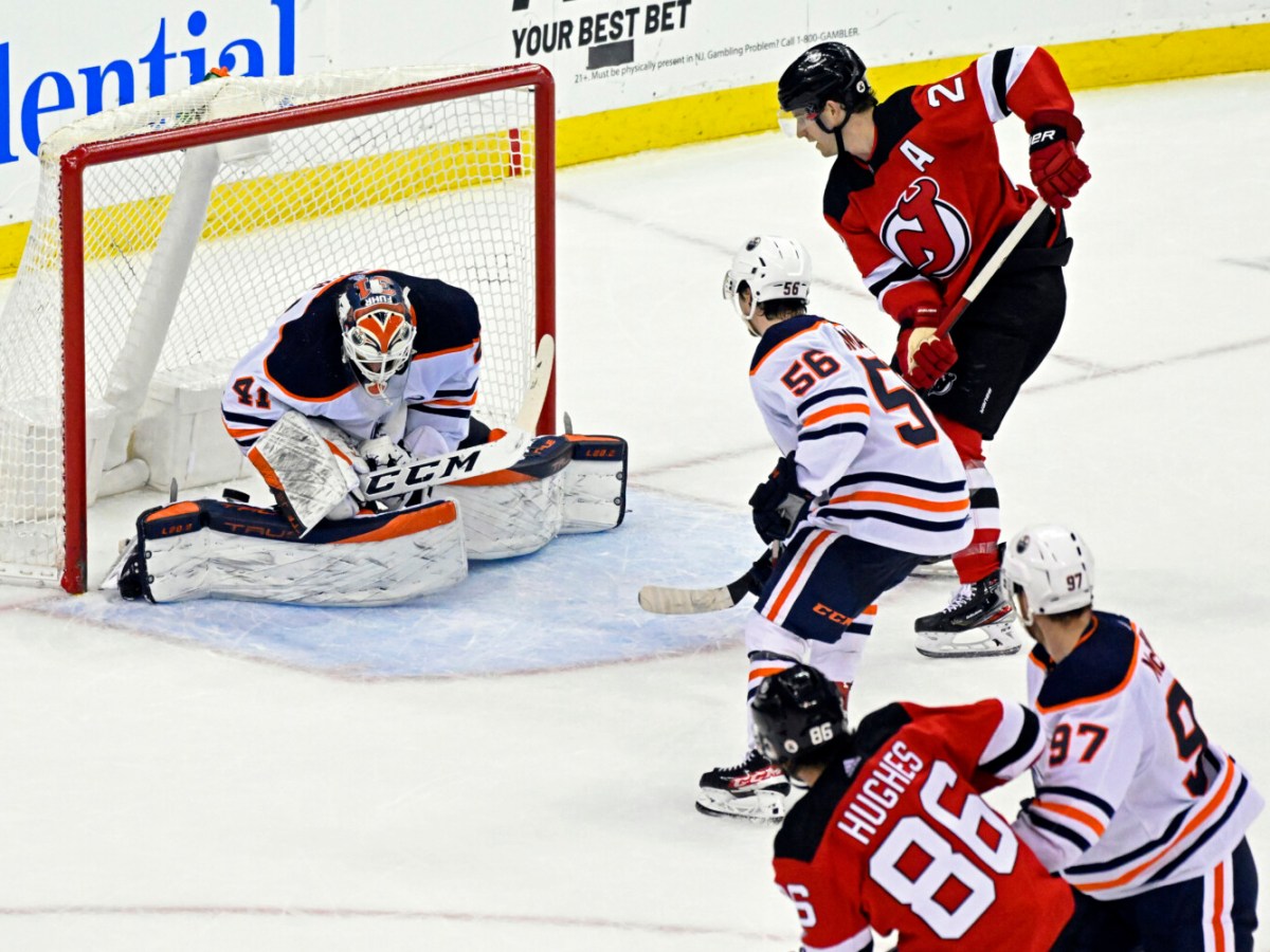 Playing without Coach Lindy Ruff after a positive COVID-19 test, New Jersey rallies for a 6-5 win.