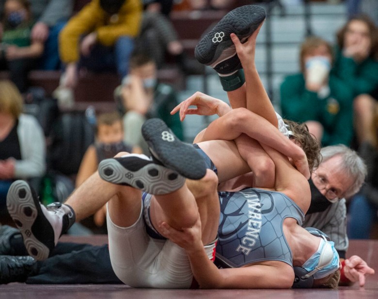 Other individual champions included Cony’s Devin Geroux (pin, 106 pounds) and Jonny Lettre (withdrawal due to injury, 220), Skowhegan’s Aiden Clark (pin, 145) and Kobe Butters (5-3, 285), Camden Hills’ Julian Henderson (pin, 120) and Henry Pharris (11-4, 182), Windham/Gray-New Gloucester/Westbrook’s Ayden Cofone (pin, 113) and Mt. Blue’s Stephen Galkowski (pin, 138). Galkowski’s win came 3:06 into the match after Oxford Hills’ Hunter Wormwood slipped out of two potential pins, and gave the freshman a victory in his first regional final.