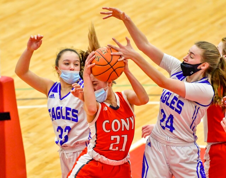 Cony burst out to a 14-5 lead in the first quarter, with Alyssa Redman and Raegan Bechard sinking 3-pointers. A Kirk triple made it 20-11 with 5:53 left in the second before Erskine began to claw back, with Roderick scoring Erskine’s last six points of the half to cut the margin to 24-23. A Redman shot with one second left gave Cony a 26-23 lead at halftime.