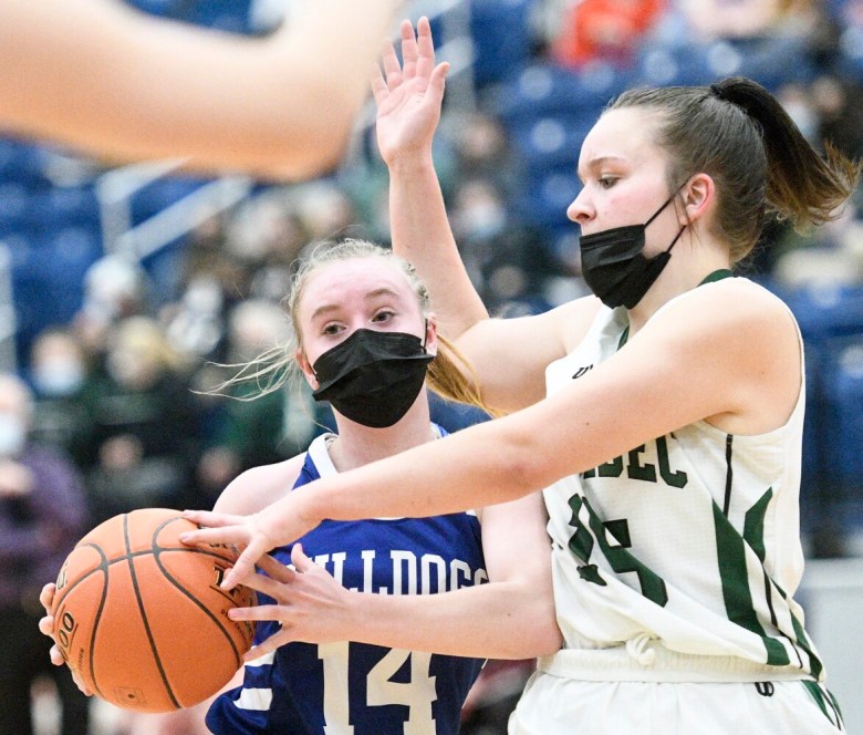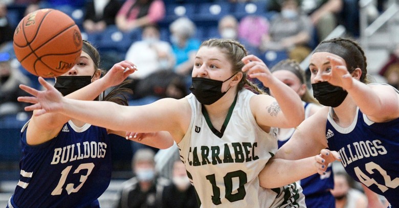 Though the regular season matchup was a runaway victory for Carrabec, it looked early on like the tournament rematch was going to be a different story. Madison’s zone defense held together to limit open looks for the Cobras, and the Bulldogs made sure to collapse and create traffic in the post whenever Cahill tried to venture inside.