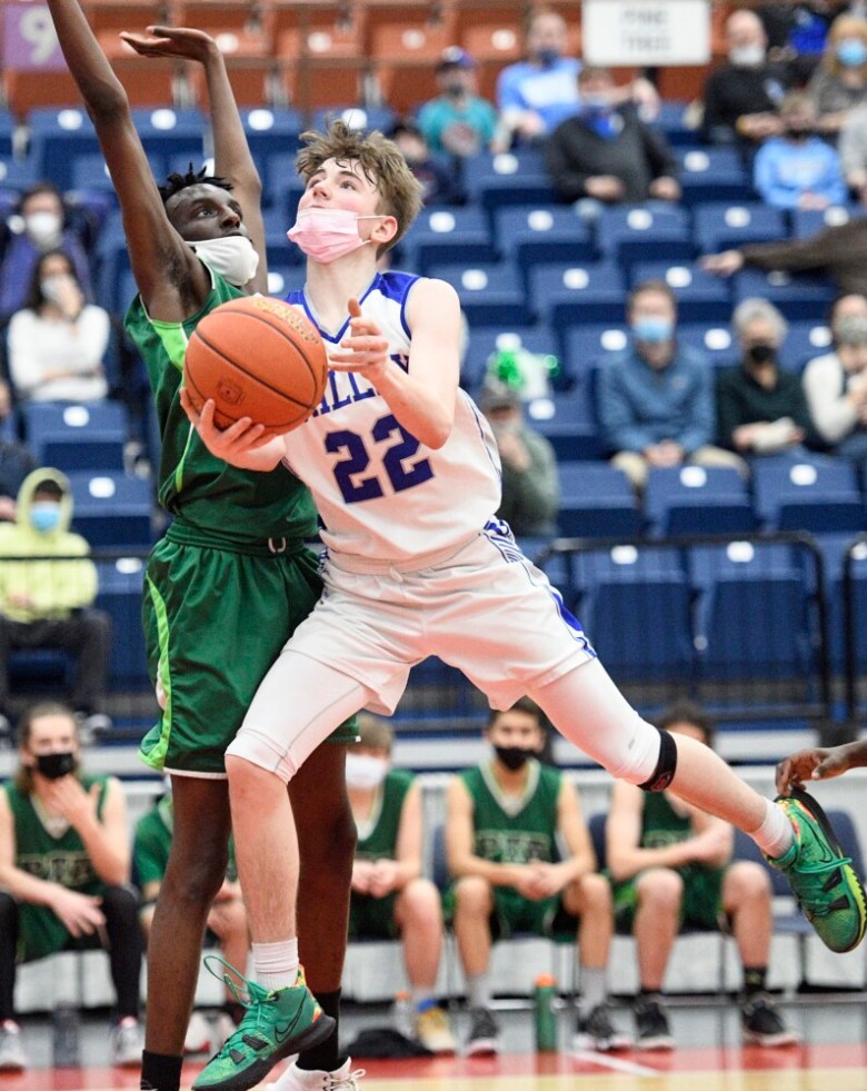 Valley eighth-grader Fisher Tewksbury goes up for a shot between Pine Tree Academy defenders Ben Ndamukunda, left, and Senis Belandria during a Class D South boys basketball semifinal game Wednesday morning at the Augusta Civic Center. Andy Molloy/Kennebec Journal