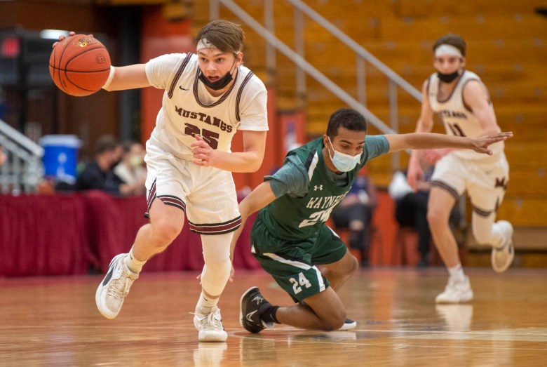 Manny Calder scored 17 points, Hunter Frost added 12 and the fifth-seeded Mustangs defeated No. 8 Waynflete 44-27 in the Class C South semifinals Thursday night.