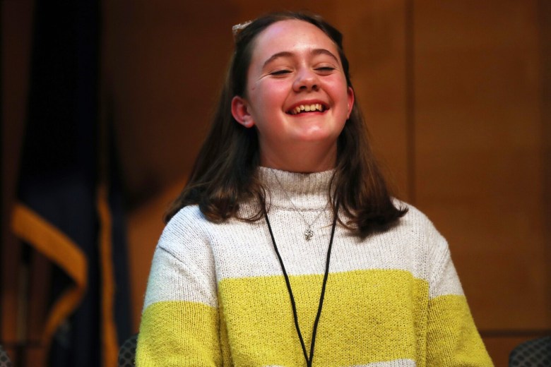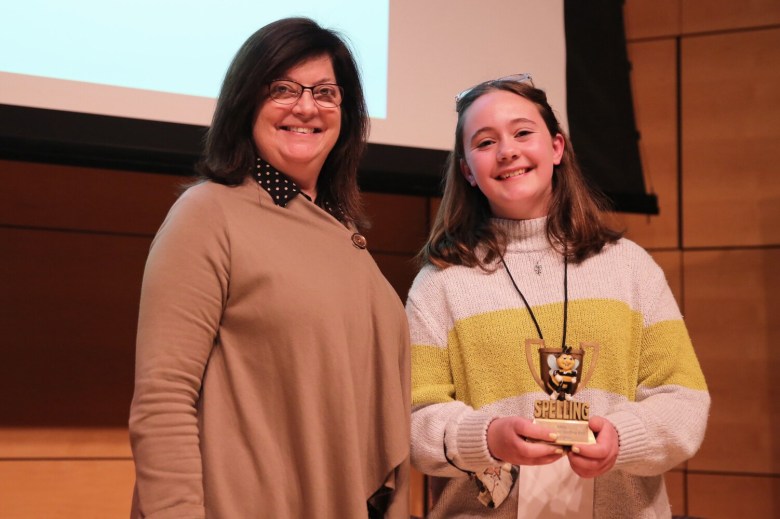 Khloe Roy, a sixth-grader from Madawaska Middle School, came in second place after incorrectly spelling “millionaire” in the 10th round. Adam Majewski, an eighth-grader from Yarmouth, and Dominique Giroux-Pare, an eighth-grader from Winslow, tied for third place. Majewski and Giroux-Pare were eliminated in the ninth round, after misspelling “navigator” and “opinionated,” respectively.