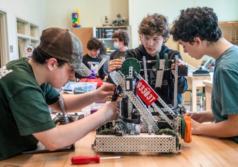 Seth Mitchell said he has help from Brian Barker, a local engineer, who coaches alongside him and teaches students to program computers. Barker’s son, Timothy, an eighth-grader, is on one of the teams headed the championship. Mitchell is an English teacher-turned-technology integrator at Monmouth Memorial School.