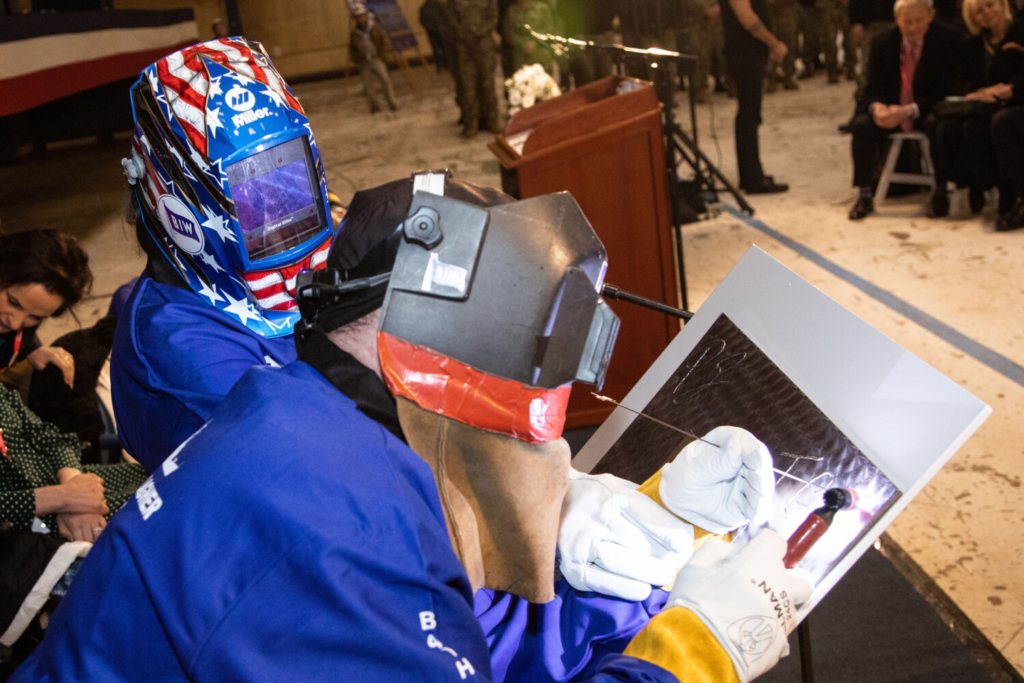 The sponsors authenticated the keel by striking welding arcs onto a steel plate that will be incorporated into the ship. They were assisted by Edward Hayes, a senior welder with 33 years of experience at BIW who is helping build the future USS Patrick Gallagher.