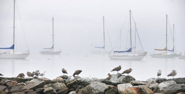 PORTLAND, ME - SEPTEMBER 19: Fog shrouded the sail boats at anchor off East End Beach in Portland. Herring Gulls line up on a stone breakwater at Portland's East End Beach on a foggy morning. (Photo by John Ewing/Staff Photographer)