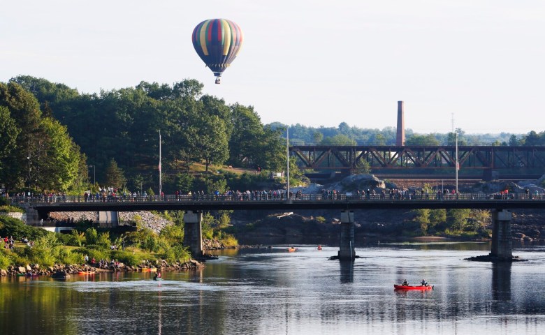 LEWISTON, ME - AUGUST 20: Spectators take to bridges and boats to view the skies at the Great Falls Balloon Festival. (Staff photo by Jill Brady/Staff Photographer)