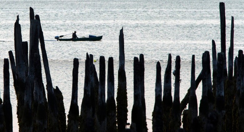 A man motors a small boat past abandoned pilings near Ocean Gateway.
