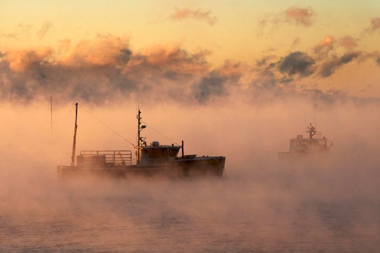 CAPE PORPOISE, ME - JANUARY 1: A rising sun colors sea smoke surrounding lobster boats in Cape Porpoise harbor in below zero temperatures on Monday, January 1, 2018. (Staff Photo by Gregory Rec/Staff Photographer)
