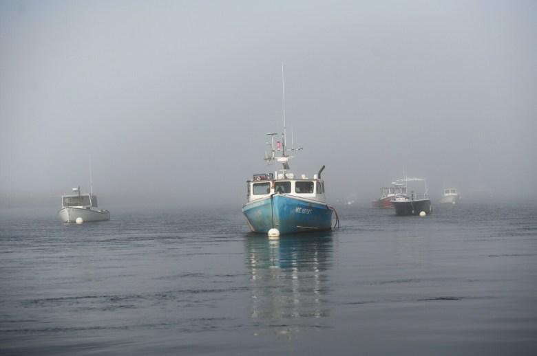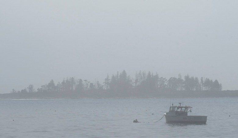 CAPE ELIZABETH, ME - AUGUST 24: A lobster boat tied to its mooring in the fog at Kettle Cove in Cape Elizabeth Tuesday, August 24, 2021. (Staff Photo by Shawn Patrick Ouellette/Staff Photographer)