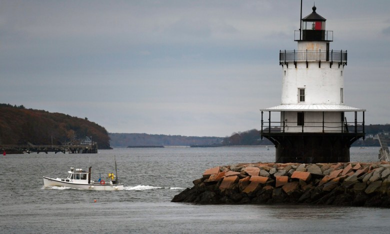 SOUTH PORTLAND, ME - OCTOBER 26: A lobster boat motors past Spring Point Ledge Lighthouse in South Portland Monday, October 26, 2020. (Staff Photo by Shawn Patrick Ouellette/Staff Photographer)