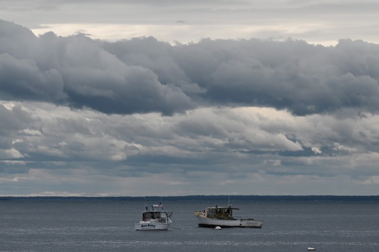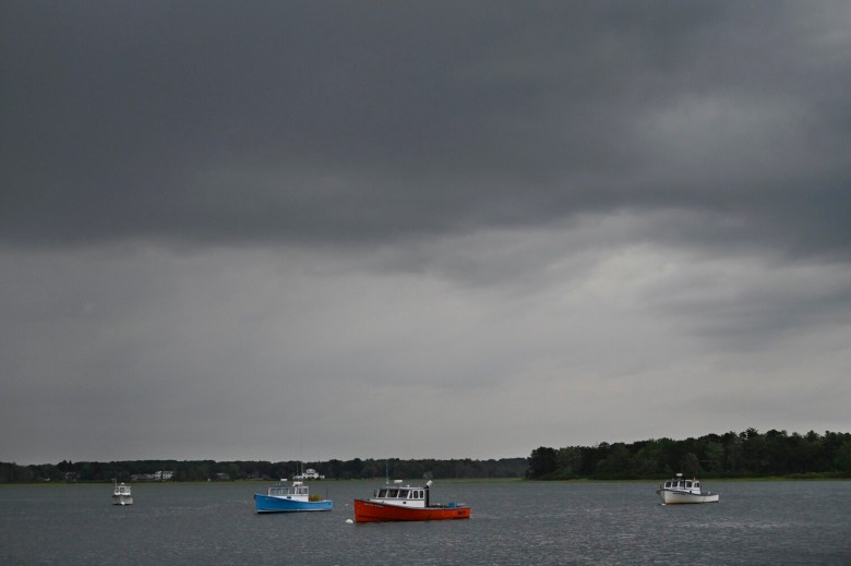SCARBOROUGH, ME - JULY 29: Lobster boats at their moorings as dark clouds roll overhead before the rain began to fall Thursday, July 29, 2021. (Staff Photo by Shawn Patrick Ouellette/Staff Photographer)