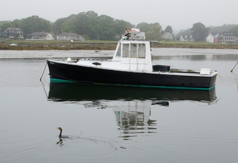 CAPE PORPOISE, ME - JULY 14: A cormorant swims by a lobster boat in Cape Porpoise harbor on Wednesday, July 14, 2021. (Staff photo by Gregory Rec/Staff Photographer)