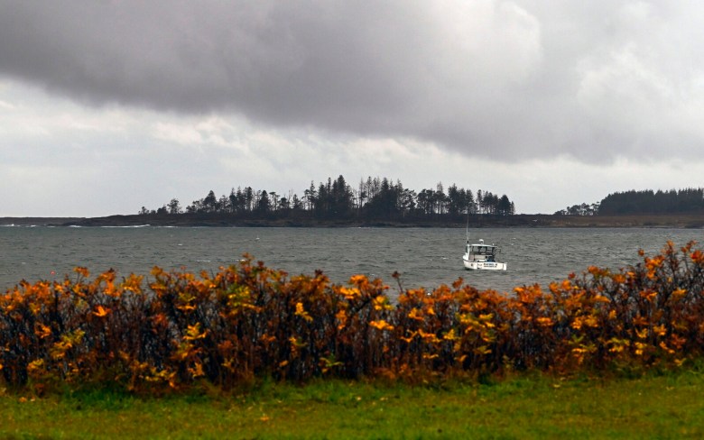 CAPE ELIZABETH, ME - NOVEMBER 22: A lobster boat is tied at its mooring in Kettle Cove as clouds roll overhead Monday, November 22, 2021. (Shawn Patrick Ouellette/Staff Photographer)