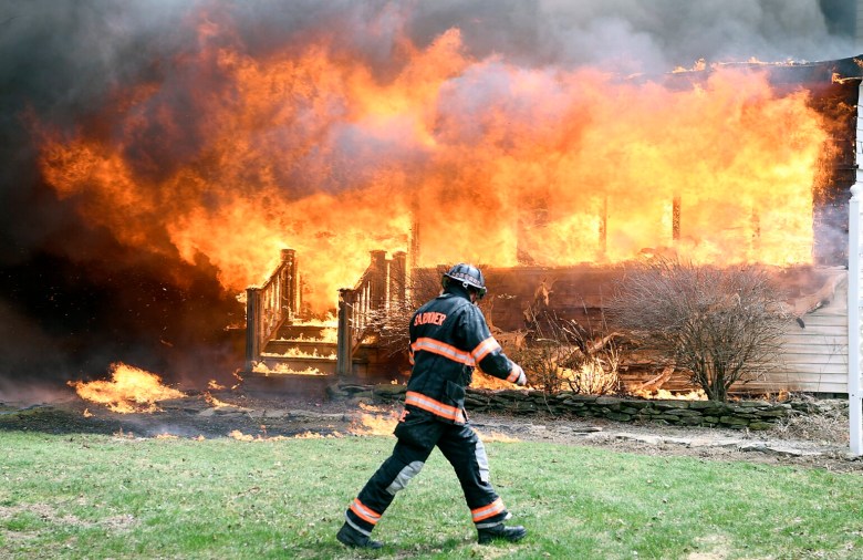 The fire consumed a three-story residence next door and spread across state Route 194, starting a blaze at one of the 25 buildings in the Tuthill antique village, which spans about 50 acres.