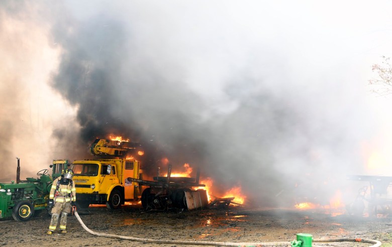 Meanwhile, explosions were emanating from within the structures and equipment yard — which contains excavation equipment, tractors and trailers — as of 2:15 p.m. Blasts could be heard in Gardiner.