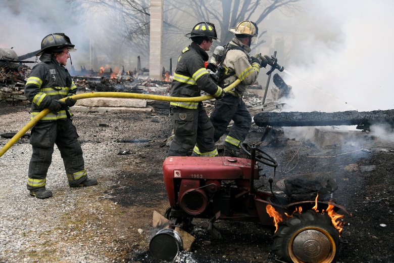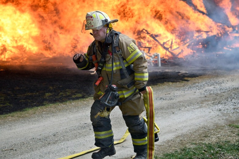 The fire consumed a three-story residence next door and spread across state Route 194, starting a blaze at one of the 25 buildings in the Tuthill antique village, which spans about 50 acres.