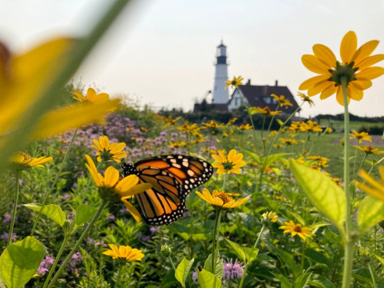 A monarch butterfly feeds on flowers in front of Portland Head Light at Fort Williams Park. The Maine Butterfly Survey says flight periods for monarchs peak in late July, which is likely the arrival of that year’s third brood, then sightings continue to ramp up, hitting its highest point in early September, as the fourth brood takes to the wing and begins the long migration south.