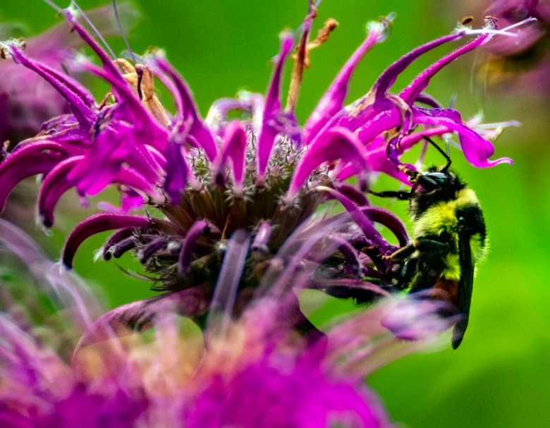 A bee crawls on a bee balm blossom in Hallowell. Different varieties of bee balm flowers come in a range of pink, red, and purple and they attract bees, hummingbirds and butterflies.