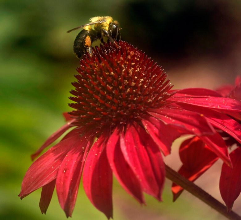 A bumblebee walks on the spikes of an echinacea flower in Kennebunk.