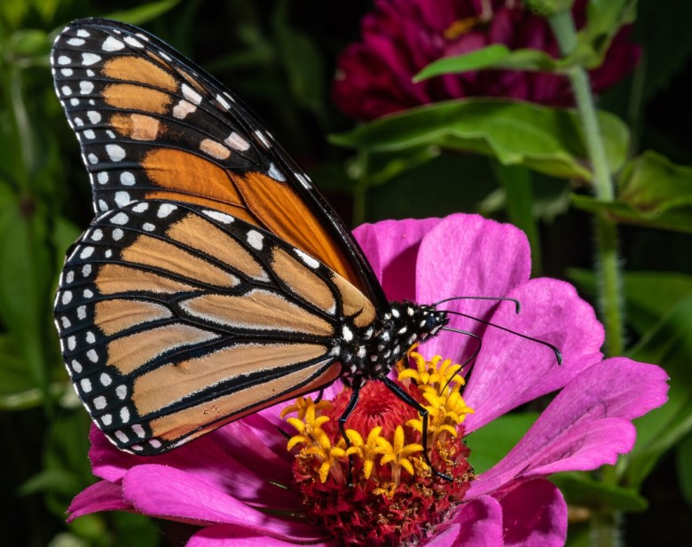 A monarch butterfly collects pollen from a flower in a garden on Mill Street in Auburn Thursday afternoon.