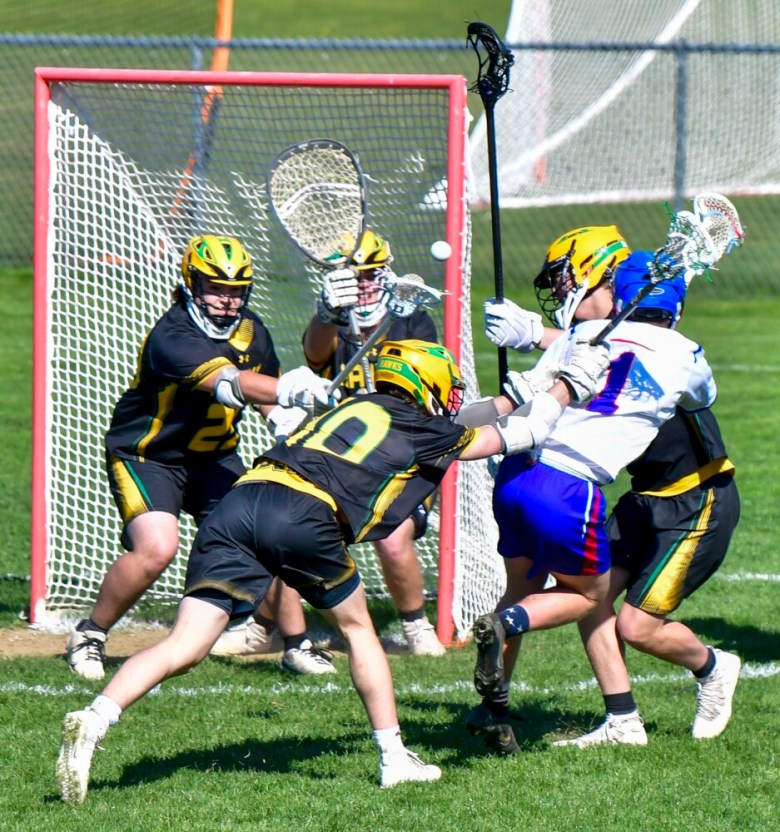 Oak Hill/Monmouth/Lisbon’s Adam Hill shoots through a crowd of Maranacook/Winthrop/SPruce Mountain defenders during a lacrosse game Tuesday at Stacen Doucette Memorial Field in Wales. Joe Phelan/Kennebec Journal