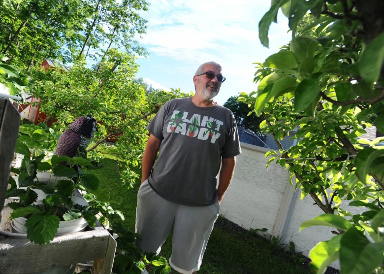 After sharing his story, Steve led a tour of his property, on which he grows lots of vegetables, flowers, fruit trees, berries and herbs, in every nook and cranny imaginable. Being home all the time, he tends to his gardens religiously — he grows everything from seed — and relishes feeding Sue the good food that he cooks. A pastry chef at the former Silent Woman restaurant in Waterville, he bakes everything from fruit pies to muffins and cinnamon rolls.