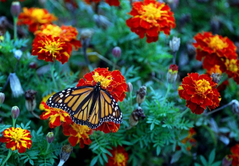 A monarch butterfly collects pollen from a flower in a garden on Mill Street in Auburn Thursday afternoon.