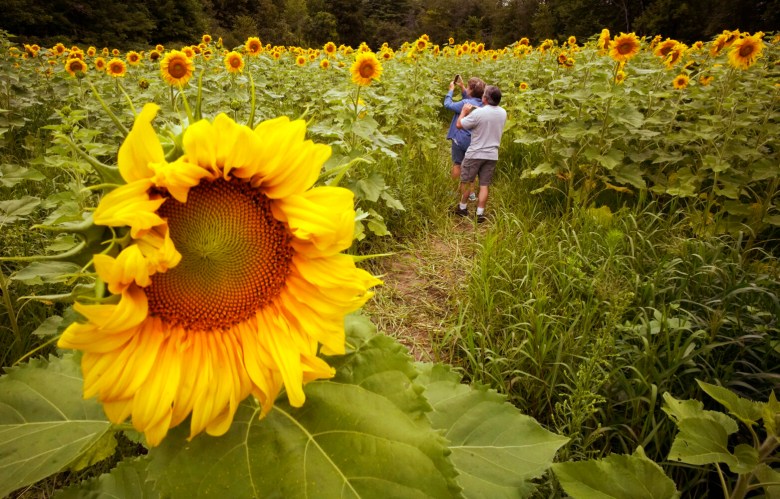 DAYTON, ME - SEPTEMBER 2: Joe and Mary Caruso take photos while walking through a field of sunflowers at Pumpkin Valley Farm in Dayton on Monday, September 2, 2019. Monday was the last day of a four-day sunflower festival at the farm, which also has a corn maze designed in the pattern of a sunflower. (Staff photo by Gregory Rec/Staff Photographer)