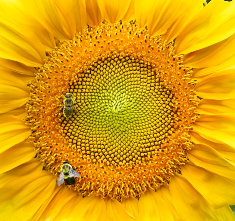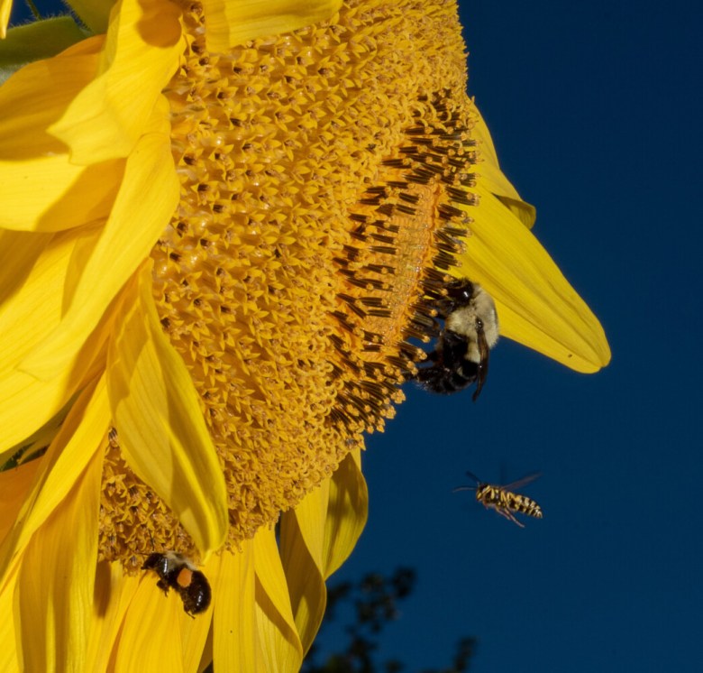 Bees collect pollen from a sunflower in a garden on Mill Street in Auburn Thursday afternoon.