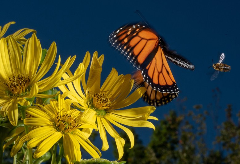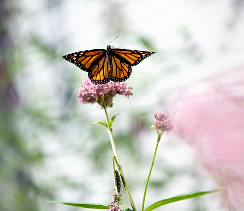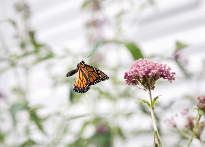 A monarch butterfly flies to a landing spot in Patricia Cluff's swamp milkweed.